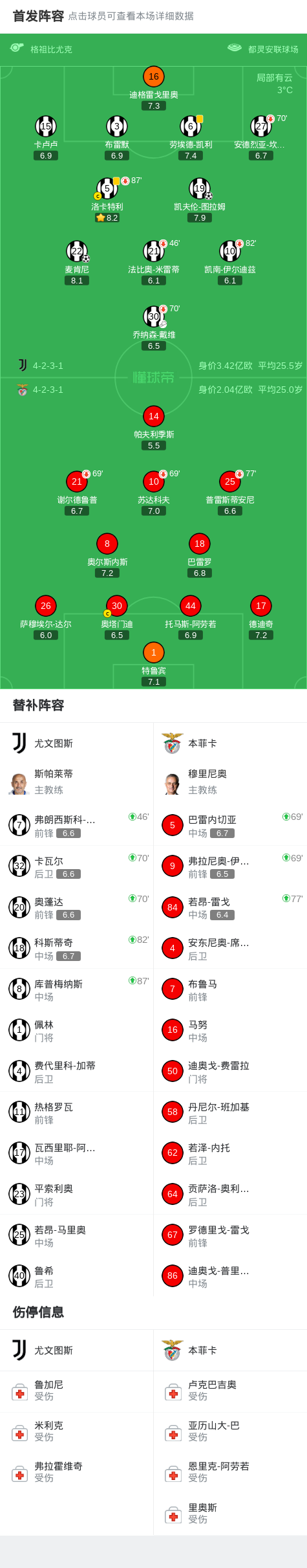 北京时间1月22日欧洲冠军联赛 联赛阶段 第7轮,尤文图斯对阵本菲卡。上半场伊尔迪兹内切兜射造险,法比奥-米雷蒂后点头球攻门高出。下半场凯夫伦-图拉姆内切突破低射破门率先拔得头筹,紧接着乔纳森-戴维送出助攻,麦肯尼前插推射破门将比分扩大。比赛尾声阶段,布雷默禁区犯规送出点球,帕夫利季斯操刀主罚失误没能改写比分,随即全场战罢,最终比分尤文 2-0 本菲卡。